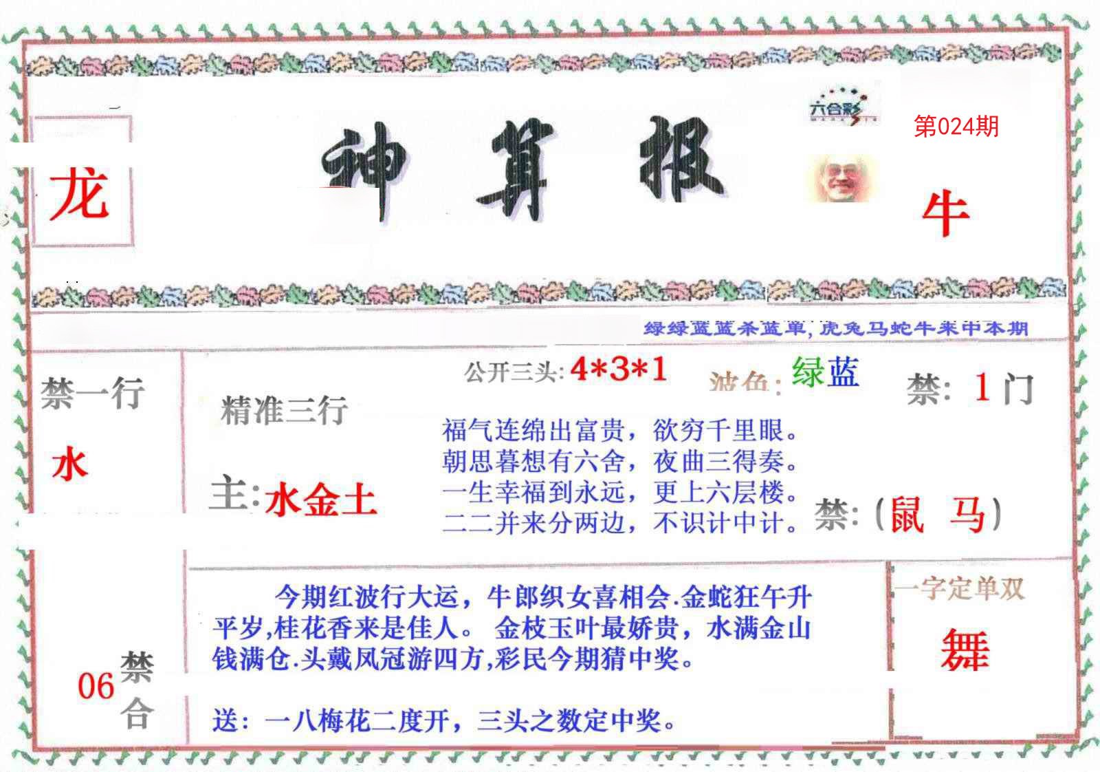 | 024期推荐五肖: 兔龙羊牛蛇 ~~稳准狠 |
